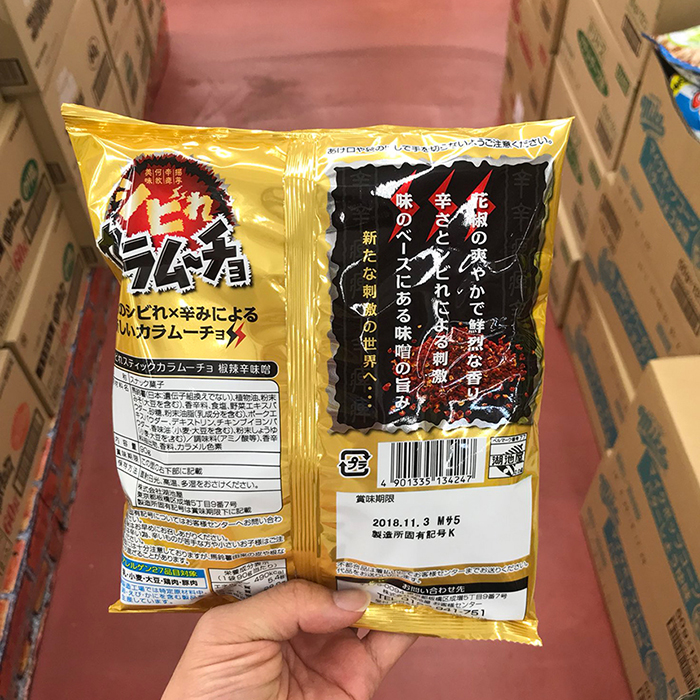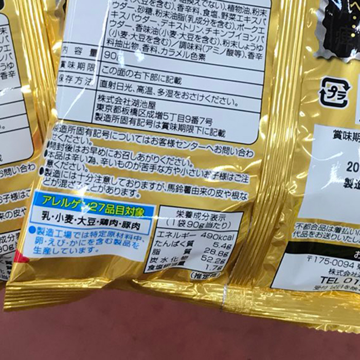 | 원재료명 | 감자 (일본 : 유전자 재조합이 아님), 식물기름, 분말 된장 (대두를 포함), 향신료, 소금, 야채 추출물 분말, 설탕, 분말 유지 (유성분 포함), 돼지 추출물 분말, 덱스트린, 치킨부이용 분말, 향미유 (밀, 대두를 포함), 분말 간장 (밀, 대두 포함) / 조미료 (아미노산 등), 향신료 추출물, 향료, 캐러멜 색소 |