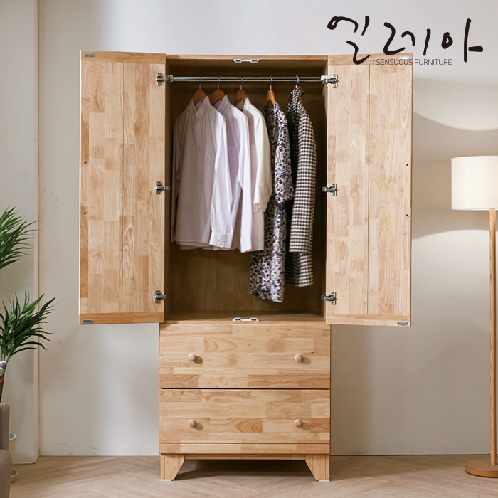 | 주요 소재 | 고무나무 원목(우레탄 도장) / MDF+PB(E1자재) / 고급 데코시트 / 180도 경첩 / 스틸 행거봉 / 원목 손잡이 / 3단볼레일 |