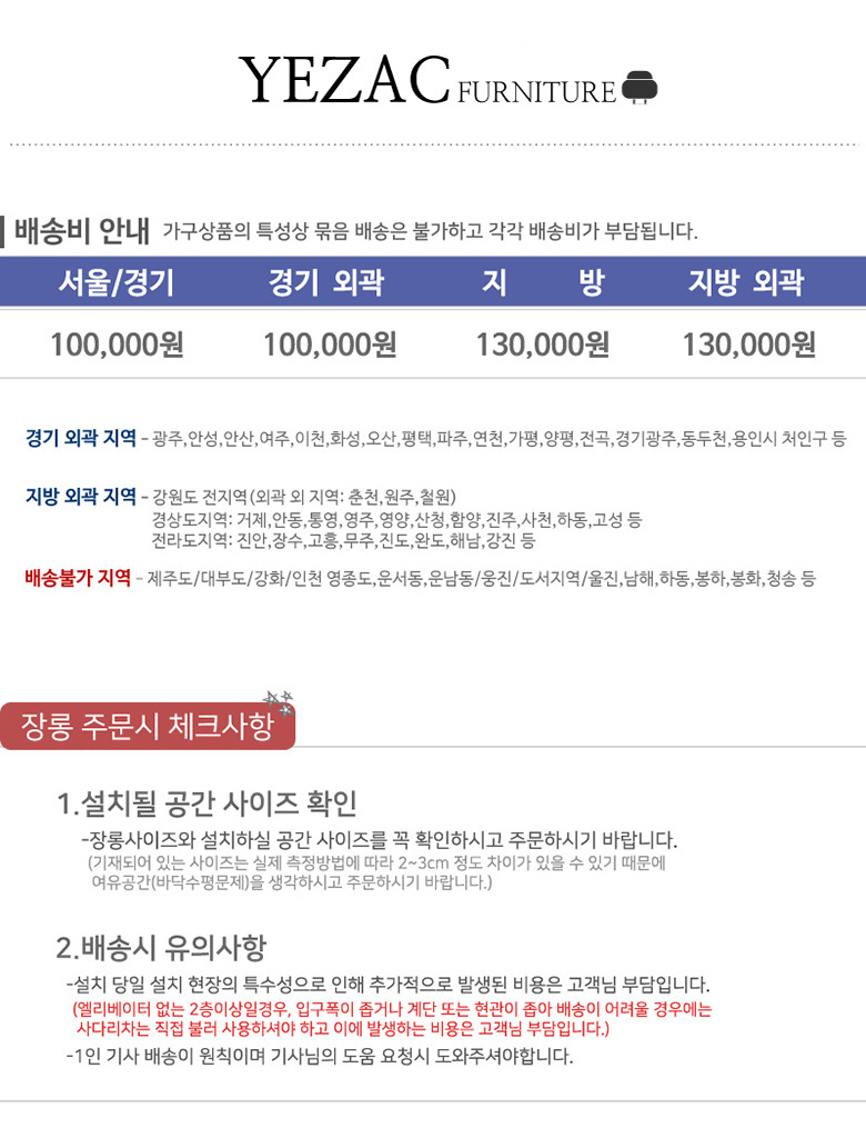(특히, 가구 등의 상품은 지역에 따라 배송제한 및 추가 배송비용이 착불로 발생할 수 있습니다.)