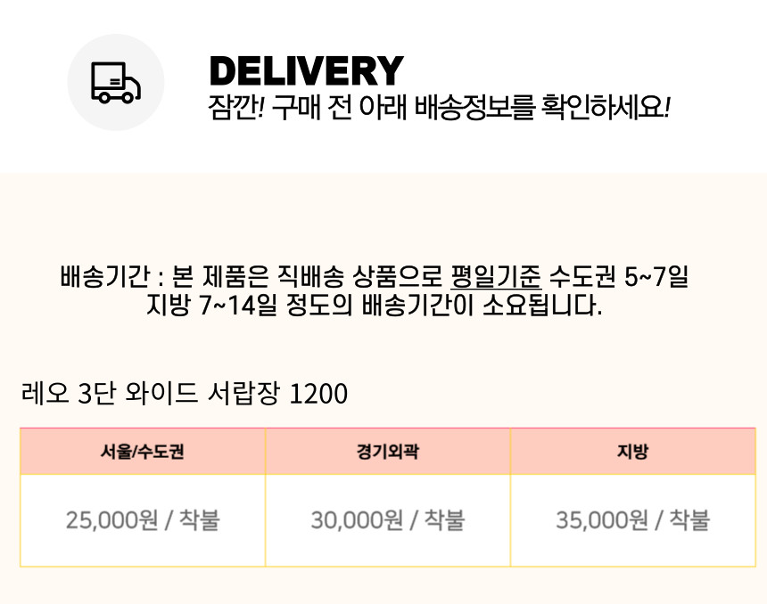 | 배송안내 | 상품페이지에 배송비(지역별 추가 배송비 등) 및 배송가능지역에 관한 브랜드 기준이 있는 경우에는 해당 내용이 우선 적용되오니, 상품상세페이지 내용을 반드시 확인해 주십시오. (특히, 가구 등의 상품은 지역에 따라 배송제한 및 추가 배송비용이 착불로 발생할 수 있습니다.) 차량의 이동이 어려운 일부 도서지역 및 제주도는 배송이 불가할 수도 있으니 반드시 상담 후 주문해 주시길 바랍니다. 배송 시 연락처 오기재 및 주소 불분명, 그리고 수취인 부재 시 배송이 지연될 수 있습니다. 사다리차 및 엘리베이터 사용 시 발생하는 비용 및 단순변심에 의한 반품/교환 왕복배송비는 고객님께서 부담해주셔야 합니다. |