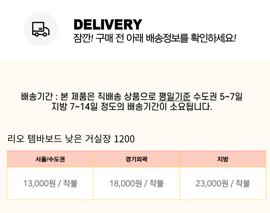| 배송안내 | 상품페이지에 배송비(지역별 추가 배송비 등) 및 배송가능지역에 관한 브랜드 기준이 있는 경우에는 해당 내용이 우선 적용되오니, 상품상세페이지 내용을 반드시 확인해 주십시오. (특히, 가구 등의 상품은 지역에 따라 배송제한 및 추가 배송비용이 착불로 발생할 수 있습니다.) 차량의 이동이 어려운 일부 도서지역 및 제주도는 배송이 불가할 수도 있으니 반드시 상담 후 주문해 주시길 바랍니다. 배송 시 연락처 오기재 및 주소 불분명, 그리고 수취인 부재 시 배송이 지연될 수 있습니다. 사다리차 및 엘리베이터 사용 시 발생하는 비용 및 단순변심에 의한 반품/교환 왕복배송비는 고객님께서 부담해주셔야 합니다. |
