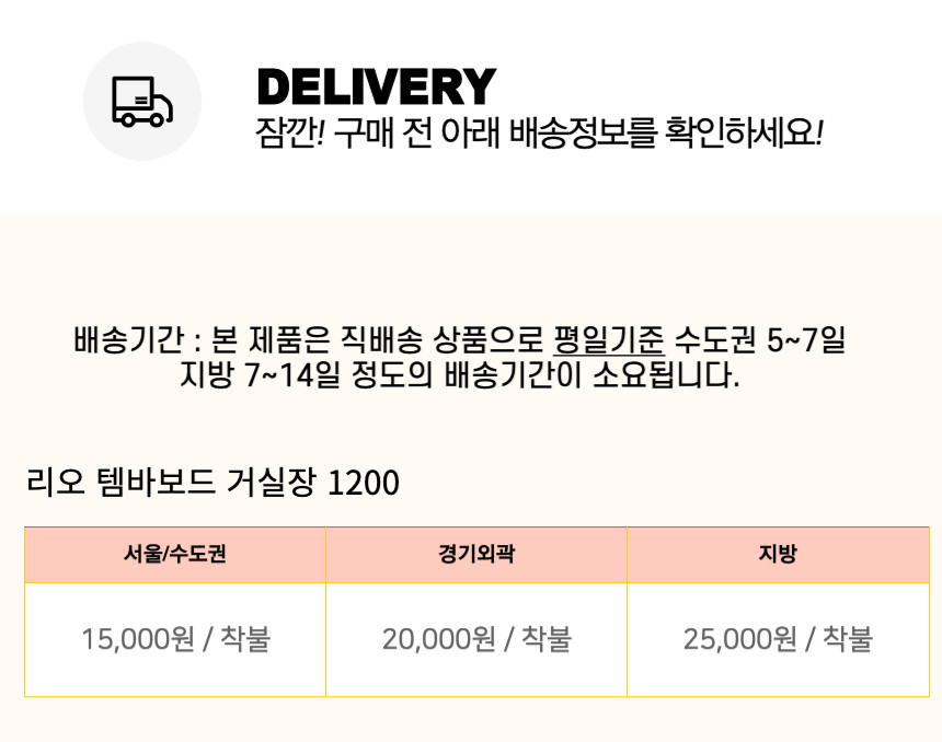 | 배송안내 | 상품페이지에 배송비(지역별 추가 배송비 등) 및 배송가능지역에 관한 브랜드 기준이 있는 경우에는 해당 내용이 우선 적용되오니, 상품상세페이지 내용을 반드시 확인해 주십시오. (특히, 가구 등의 상품은 지역에 따라 배송제한 및 추가 배송비용이 착불로 발생할 수 있습니다.) 차량의 이동이 어려운 일부 도서지역 및 제주도는 배송이 불가할 수도 있으니 반드시 상담 후 주문해 주시길 바랍니다. 배송 시 연락처 오기재 및 주소 불분명, 그리고 수취인 부재 시 배송이 지연될 수 있습니다. 사다리차 및 엘리베이터 사용 시 발생하는 비용 및 단순변심에 의한 반품/교환 왕복배송비는 고객님께서 부담해주셔야 합니다. |