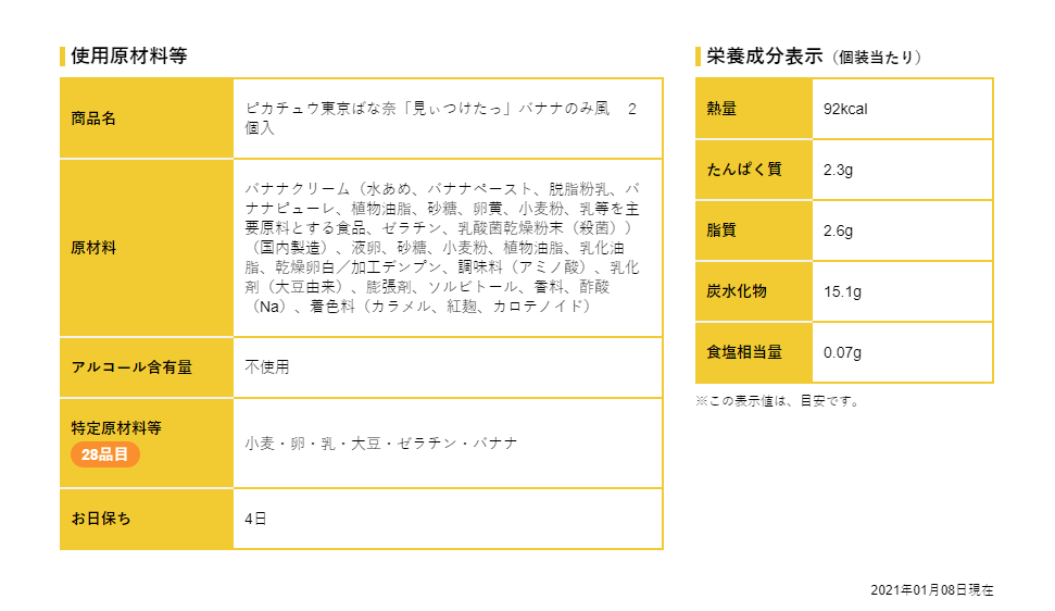| 원재료명 | 바나나 크림 (물엿, 바나나 페이스트, 탈지 분유, 설탕)바나나 퓨레( 식물성 유지, 달걀 노른자, 밀가루, 젤라틴), 계란, 설탕, 밀가루, 식물성 유지, 건조 달걀 흰자위, 가공 전분, 조미료 (아미노산), 유화제 (대두 유래), 팽창 방지제,소르비톨, 향료, 아세트산 (Na), 카로틴 색소 |