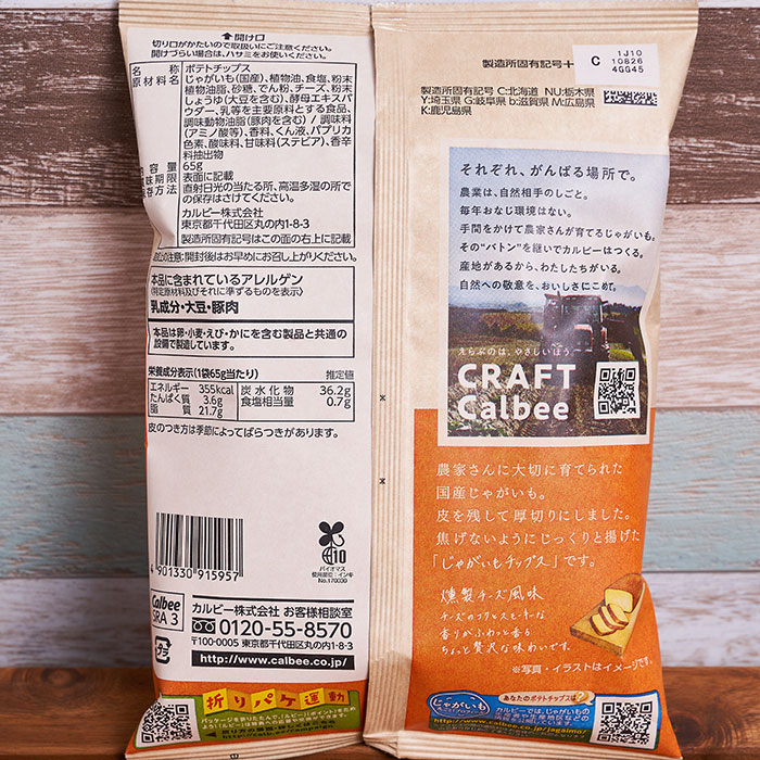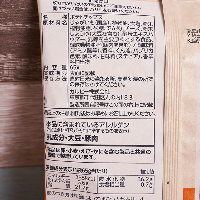 | 원재료명 | 감자, 식물유, 식염, 분말식물유지, 설탕, 전분, 치즈, 분말 간장(대두 포함), 효모엑스파우더, 유등을 주요 원료로 하는 식품, 조미동물유지(돼지고기 포함) / 조미료(아미노산 등), 향료, 군액, 파프리카 색소, 산미료, 감미료(스테비아), 향신료 추출물 |