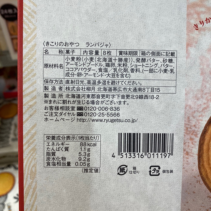 | 원재료명 | 밀가루(밀(홋카이도 도카치산)), 발효 버터, 설탕, 아몬드 푸들, 계란, 쌀가루, 쇼트닝, 버터, 코코아 파우더, 식염 / 유화제, 향료, (일부에 밀, 유성분, 계란, 아몬드, 대두를 포함) |