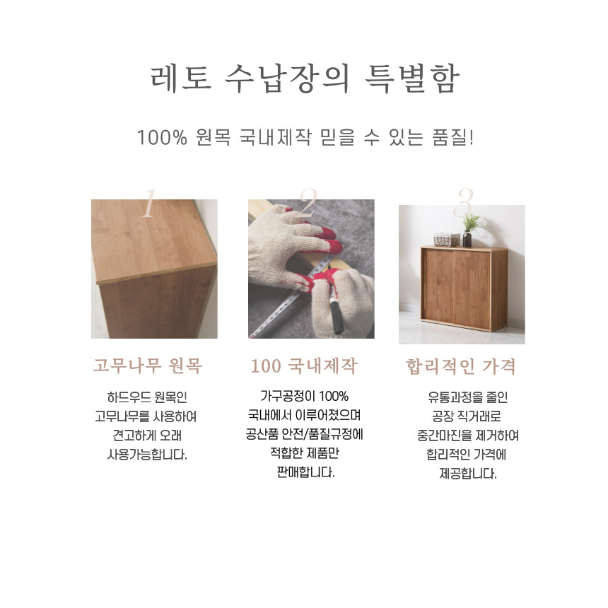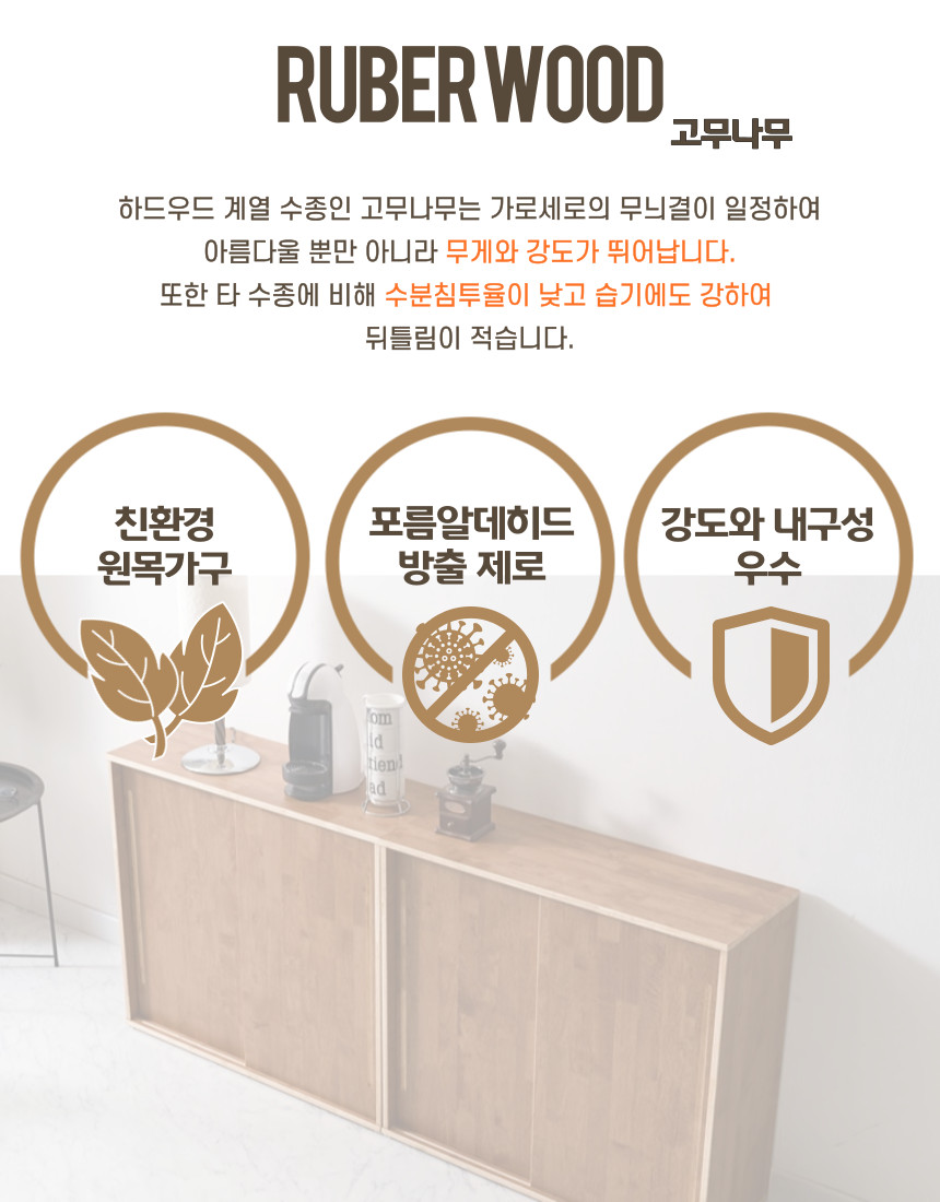 | 주요 소재 | 고무나무 원목, UV도장, 고무나무합판(뒷판) |