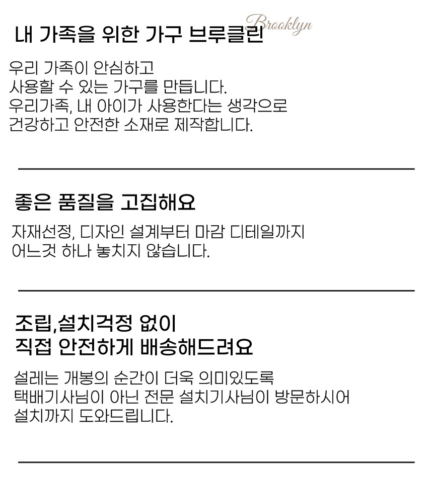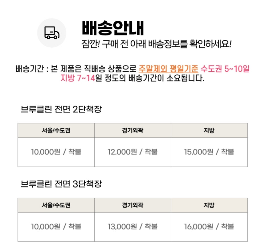 | 배송안내 | 상품페이지에 배송비(지역별 추가 배송비 등) 및 배송가능지역에 관한 브랜드 기준이 있는 경우에는 해당 내용이 우선 적용되오니, 상품상세페이지 내용을 반드시 확인해 주십시오. (특히, 가구 등의 상품은 지역에 따라 배송제한 및 추가 배송비용이 착불로 발생할 수 있습니다.) 차량의 이동이 어려운 일부 도서지역 및 제주도는 배송이 불가할 수도 있으니 반드시 상담 후 주문해 주시길 바랍니다. 배송 시 연락처 오기재 및 주소 불분명, 그리고 수취인 부재 시 배송이 지연될 수 있습니다. 사다리차 및 엘리베이터 사용 시 발생하는 비용 및 단순변심에 의한 반품/교환 왕복배송비는 고객님께서 부담해주셔야 합니다. |