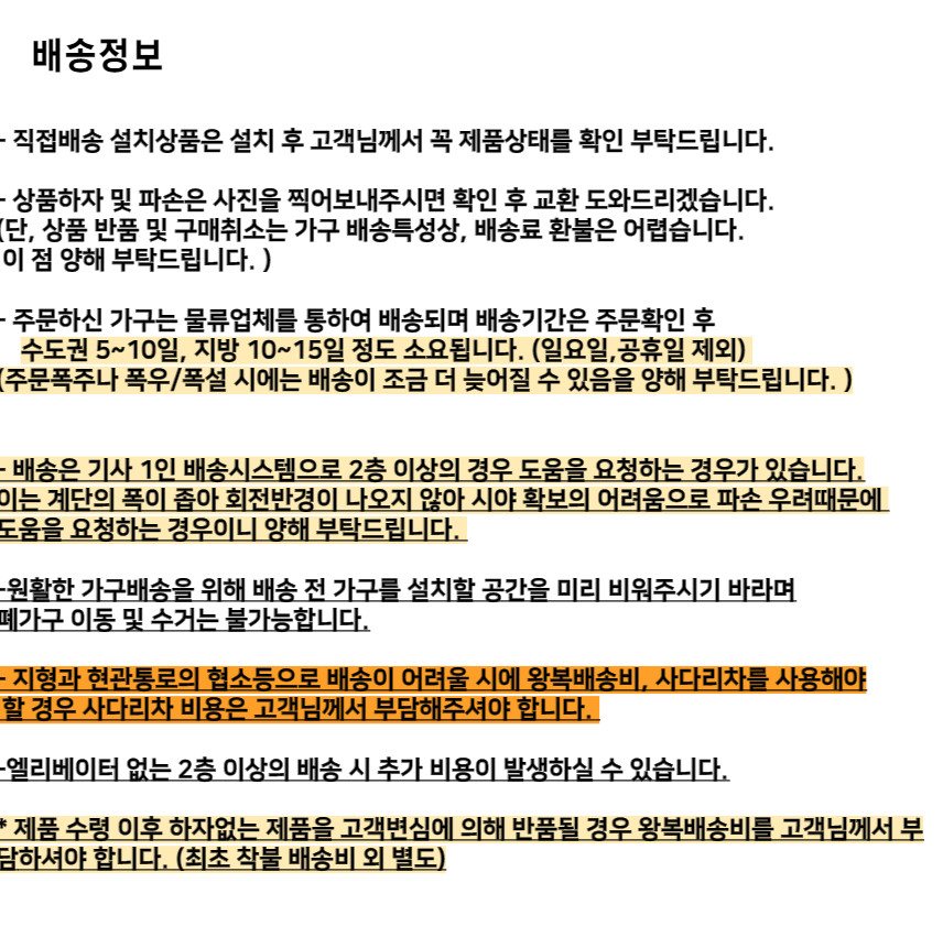 | 배송안내 | 상품페이지에 배송비(지역별 추가 배송비 등) 및 배송가능지역에 관한 브랜드 기준이 있는 경우에는 해당 내용이 우선 적용되오니, 상품상세페이지 내용을 반드시 확인해 주십시오. (특히, 가구 등의 상품은 지역에 따라 배송제한 및 추가 배송비용이 착불로 발생할 수 있습니다.) 차량의 이동이 어려운 일부 도서지역 및 제주도는 배송이 불가할 수도 있으니 반드시 상담 후 주문해 주시길 바랍니다. 배송 시 연락처 오기재 및 주소 불분명, 그리고 수취인 부재 시 배송이 지연될 수 있습니다. 사다리차 및 엘리베이터 사용 시 발생하는 비용 및 단순변심에 의한 반품/교환 왕복배송비는 고객님께서 부담해주셔야 합니다. |