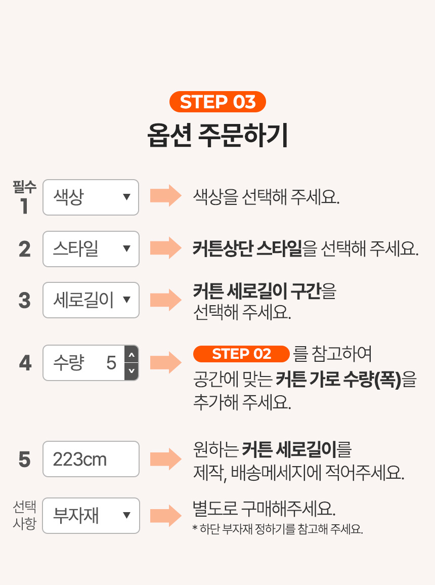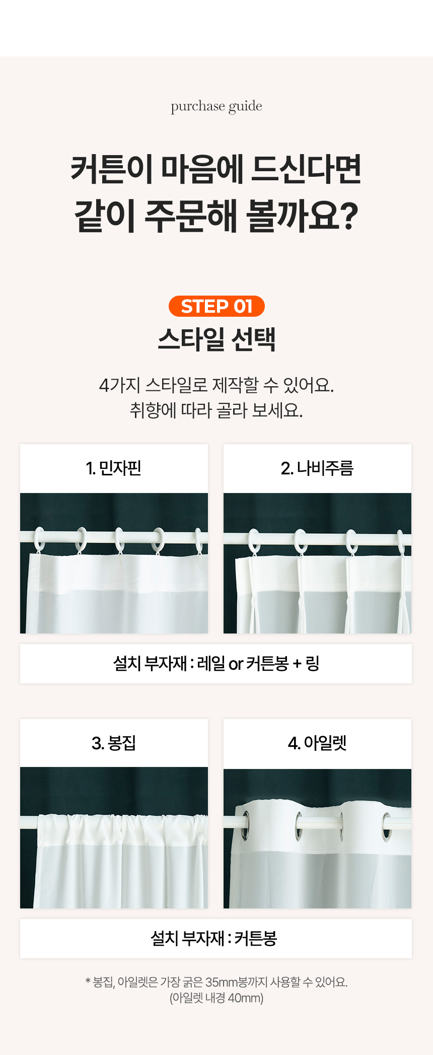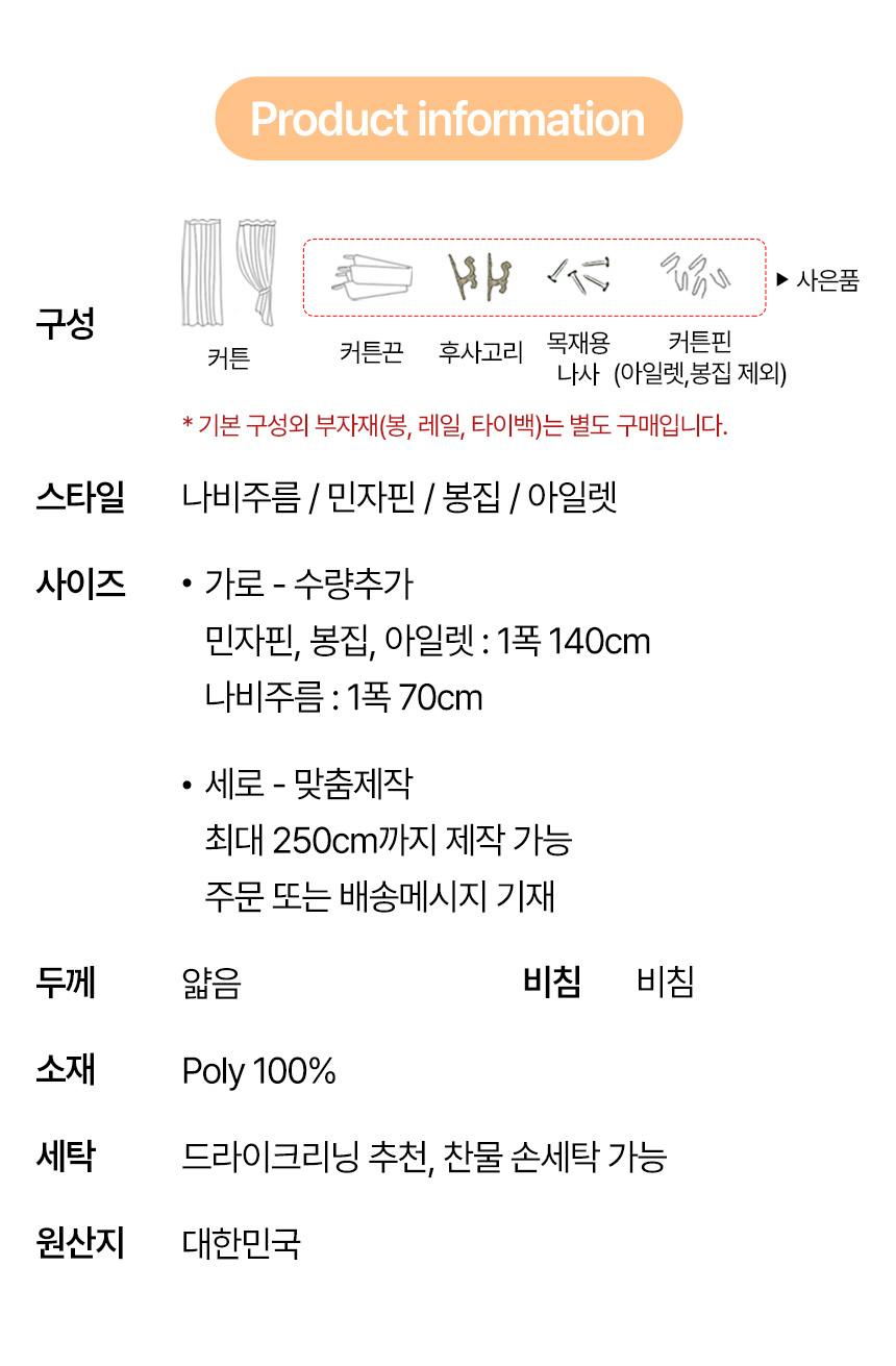 | 치수 | 나비주름)가로70cm×세로맞춤제작 / 민자핀형,봉집형,아일렛형)가로140cm×세로맞춤제작 |