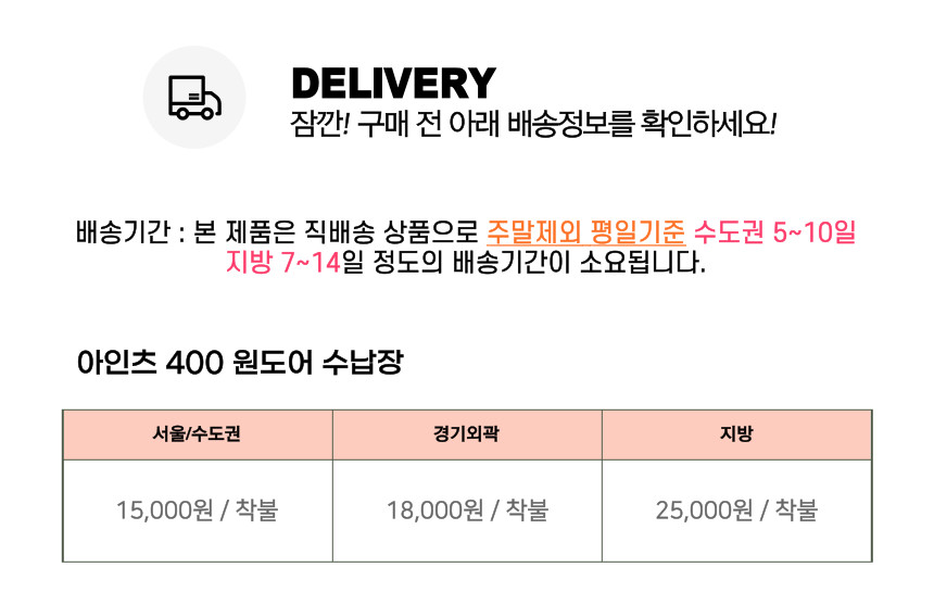 (특히, 가구 등의 상품은 지역에 따라 배송제한 및 추가 배송비용이 착불로 발생할 수 있습니다.)