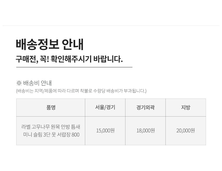| 배송·설치비용 | 유료배송/착불배송/가구화물배송/묶음배송불가/수량당 배송비 부과/변심 반품및 교환시 왕복배송비 고객부담/ |