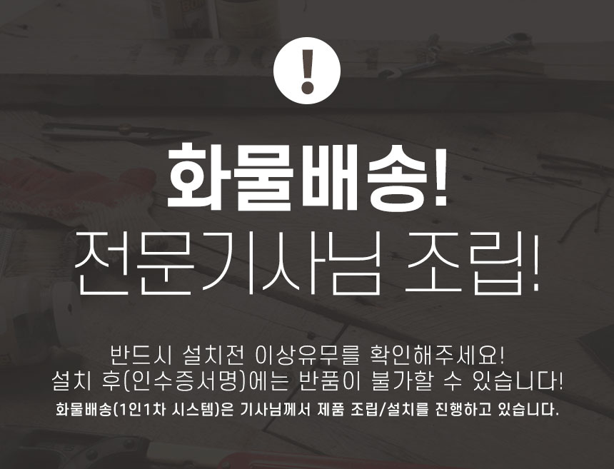 | 품질보증기준 | 제품 설치 시 반품 불가(반드시 상품 확인 후 설치 진행 요망) 오배송, 하자등에 한해 AS처리 가능. (반드시 오배송, 하자등에 관한 사진 및 자료가 있어야 처리가능) |
