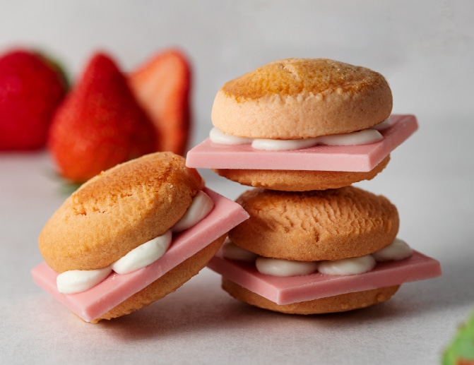 딸기를 넣고 반죽한 딸기 초콜릿을 샌드해 완성했습니다.
