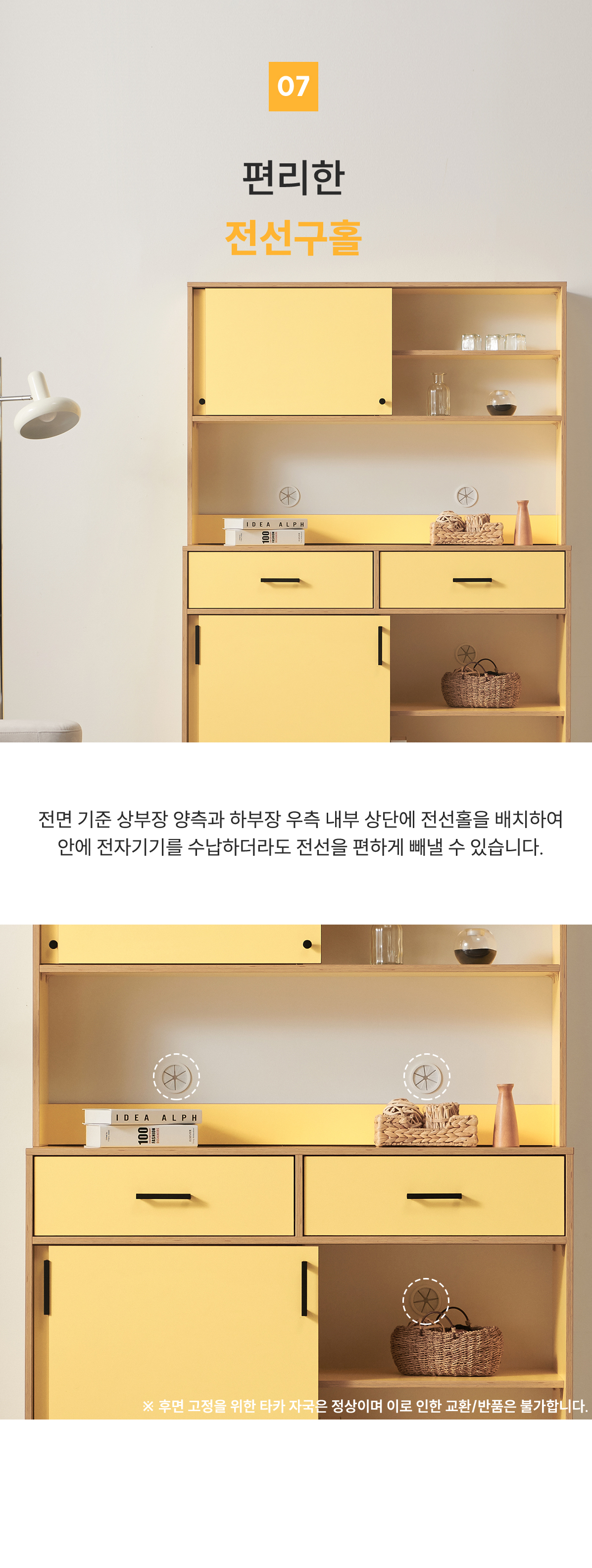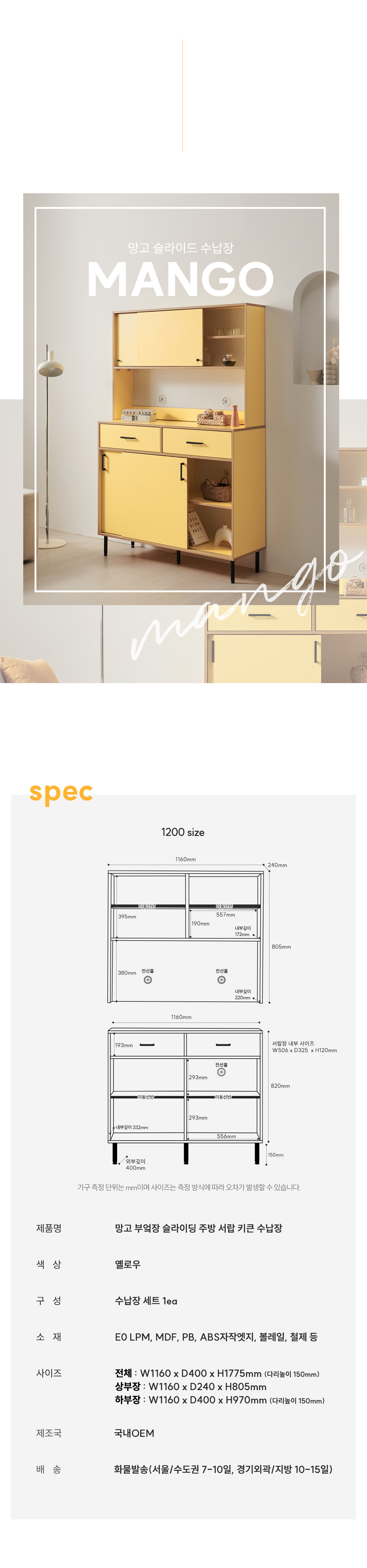 | 크기 | 전체 : W1160 x D400 x H1775mm / 상부장 : W1160 x D240 x H805mm / 수납장 : W1160 x D400 x H970mm |