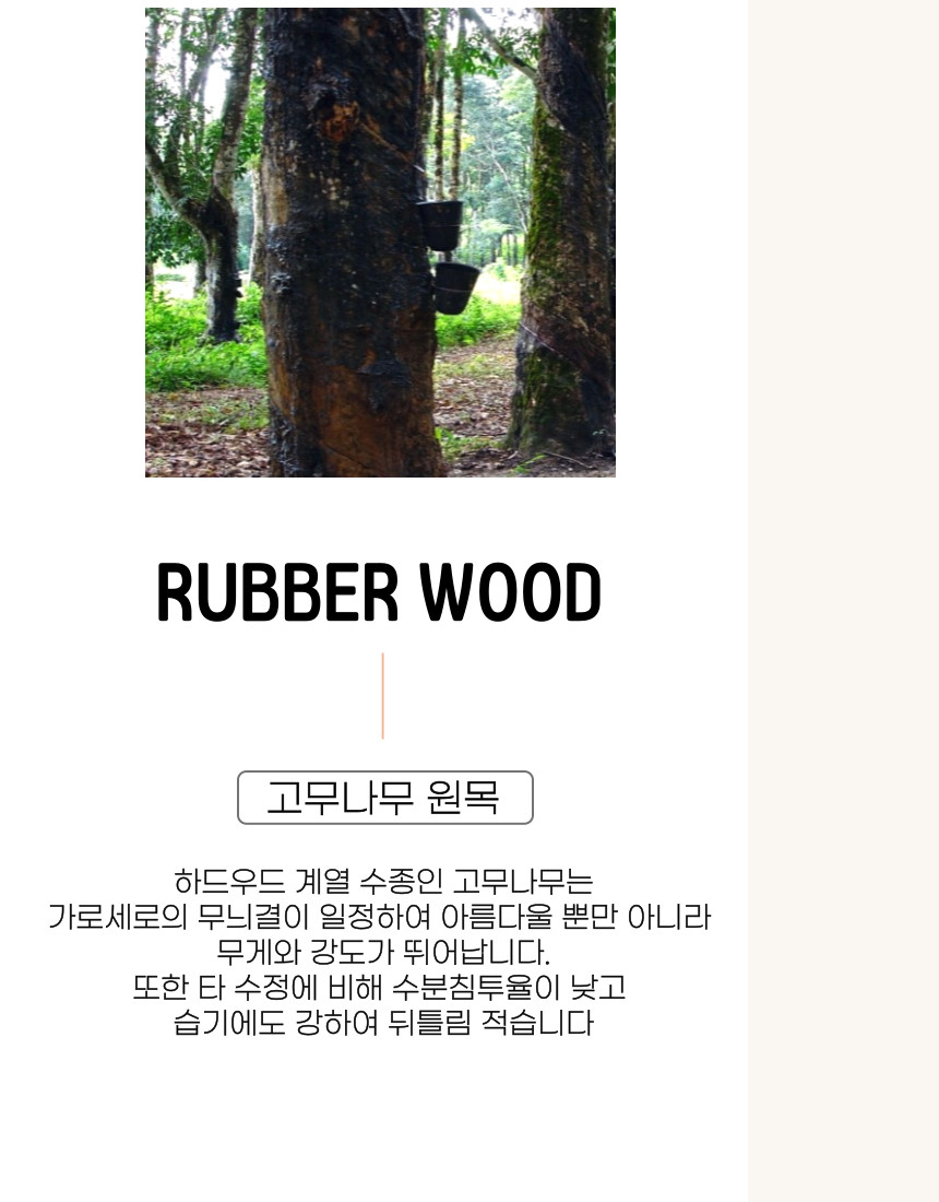 | 주요 소재 | 고무나무 원목, 우레탄 도장, 볼레일 외 |