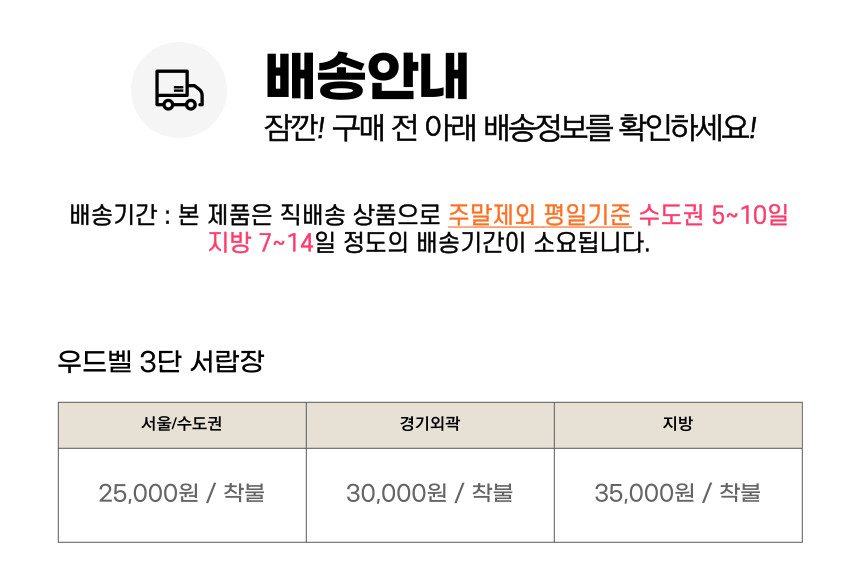 | 배송안내 | 상품페이지에 배송비(지역별 추가 배송비 등) 및 배송가능지역에 관한 브랜드 기준이 있는 경우에는 해당 내용이 우선 적용되오니, 상품상세페이지 내용을 반드시 확인해 주십시오. (특히, 가구 등의 상품은 지역에 따라 배송제한 및 추가 배송비용이 착불로 발생할 수 있습니다.) 차량의 이동이 어려운 일부 도서지역 및 제주도는 배송이 불가할 수도 있으니 반드시 상담 후 주문해 주시길 바랍니다. 배송 시 연락처 오기재 및 주소 불분명, 그리고 수취인 부재 시 배송이 지연될 수 있습니다. 사다리차 및 엘리베이터 사용 시 발생하는 비용 및 단순변심에 의한 반품/교환 왕복배송비는 고객님께서 부담해주셔야 합니다. |