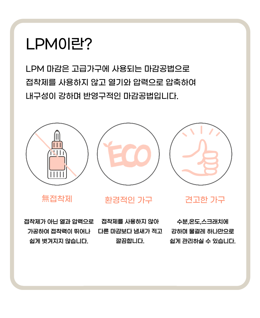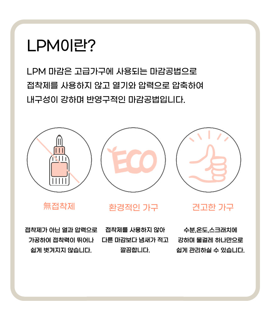 | 주요 소재 | 고무나무/멀바우 원목, LPM, PB, MDF 외 |