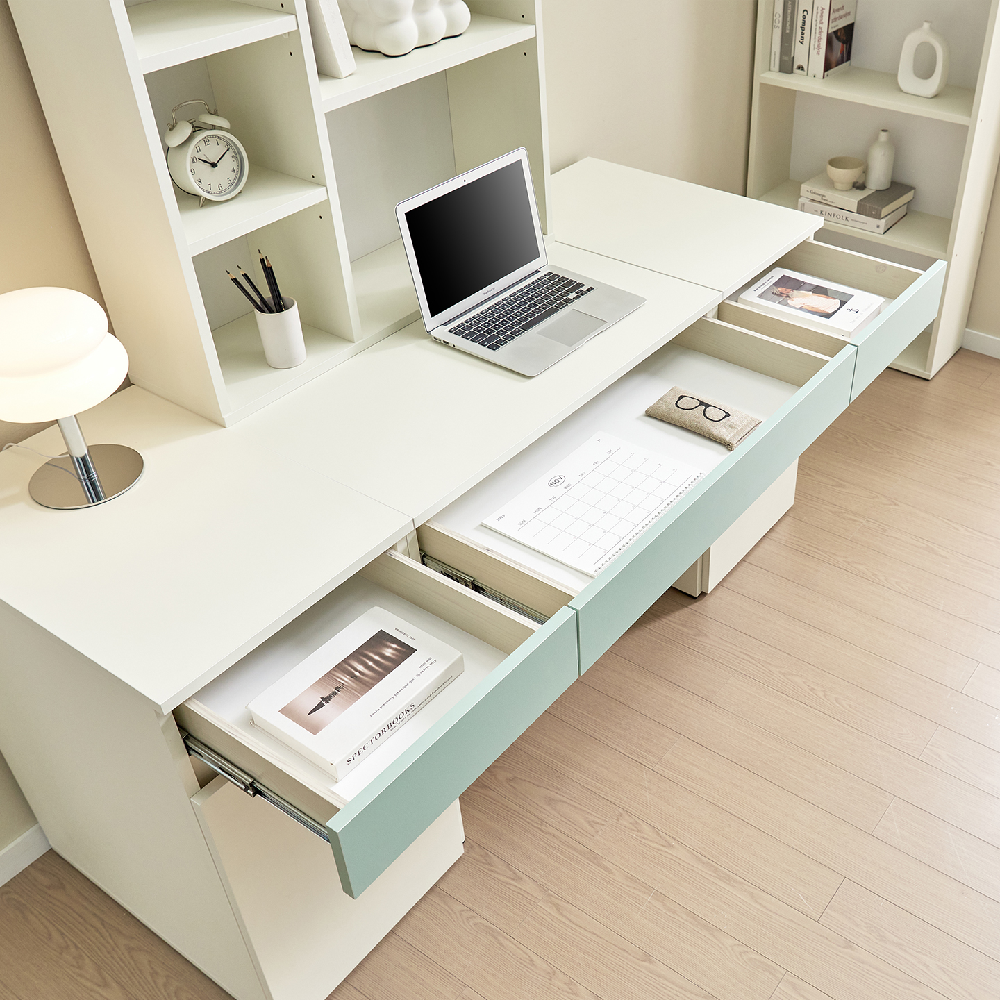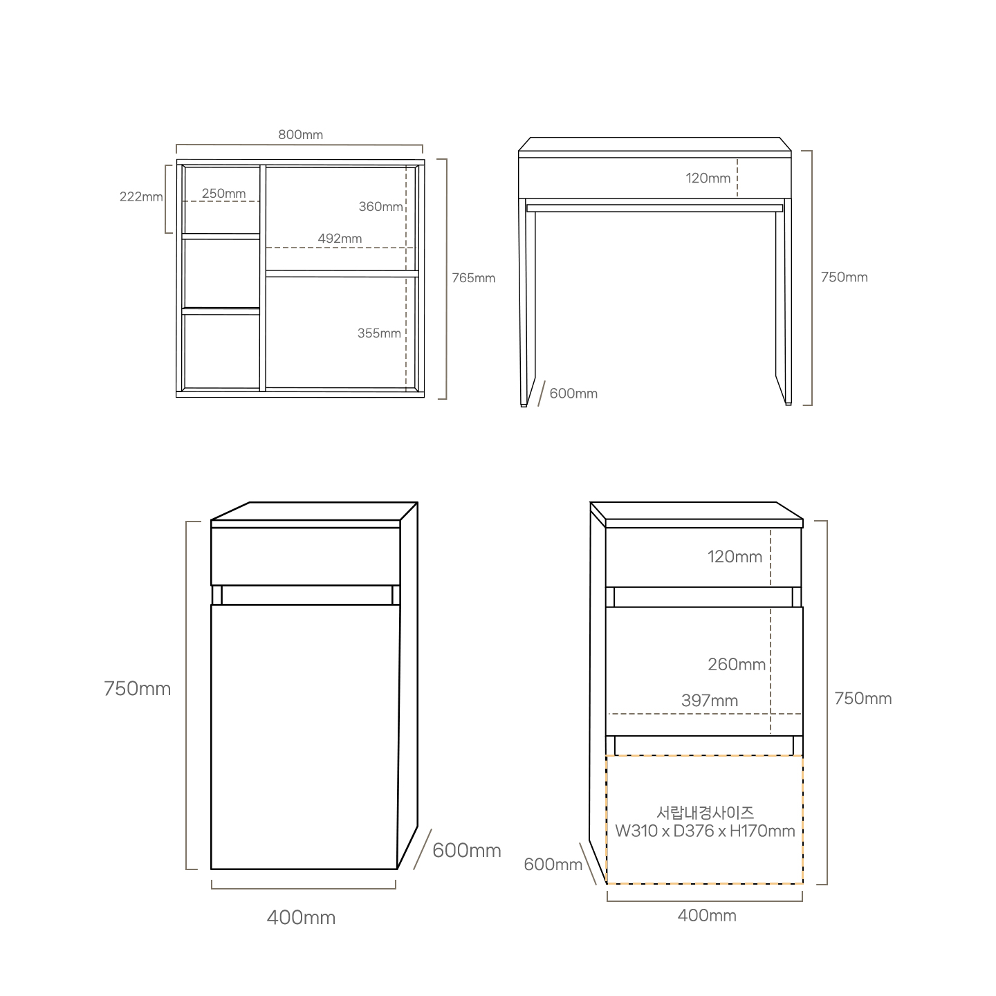 | 크기 | 책상 : W800 x D600 x H750mm / 책상책장 : W800 x D230 x H765mm / 서랍형 서랍장 : W400 x D600 x H750mm / 도어형 서랍장 : W400 x D600 x H750mm |