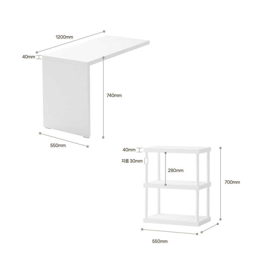 | 크기 | 1200 상판 : W1200 x D550 x H740mm / 600 2단책장(2개) : W550 x D340 x H700mm |
