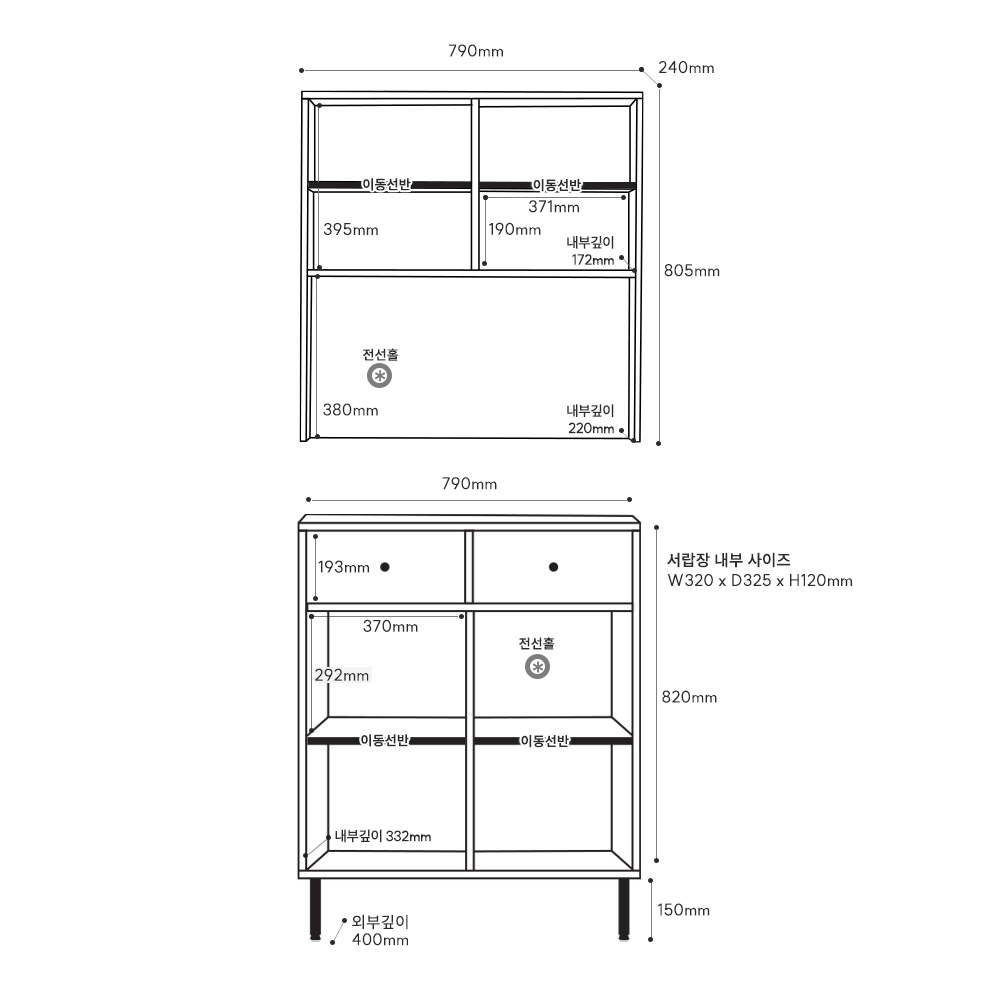 | 크기 | 전체 : W790 x D400 x H1775mm / 상부장 : W790 x D240 x H805mm / 하부장 : W790 x D400 x H970mm |
