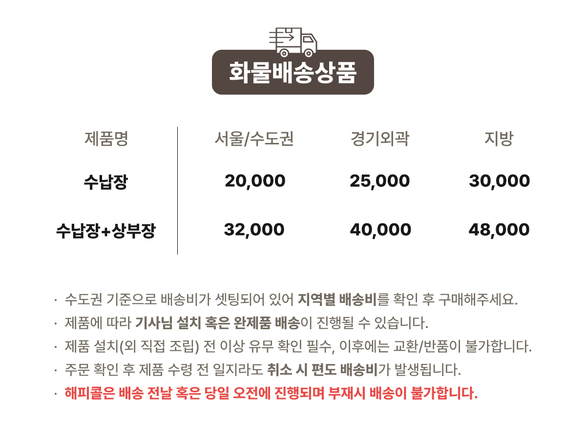 | 배송·설치비용 | 화물배송(무조건 착불배송), 상품페이지 참조 |