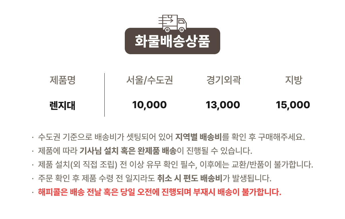| 배송·설치비용 | 화물배송(무조건 착불배송), 상품페이지 참조 |