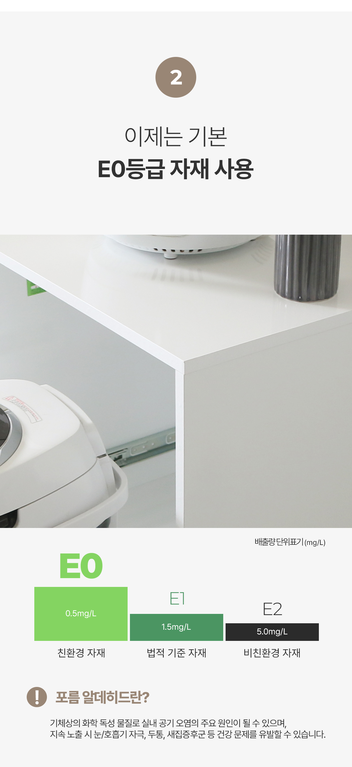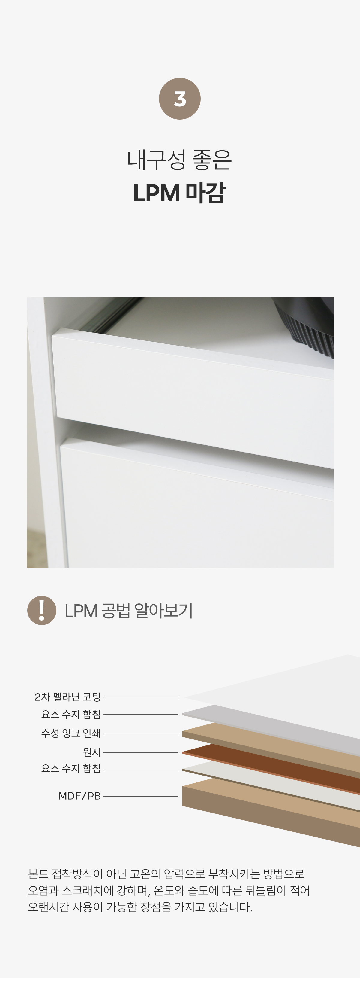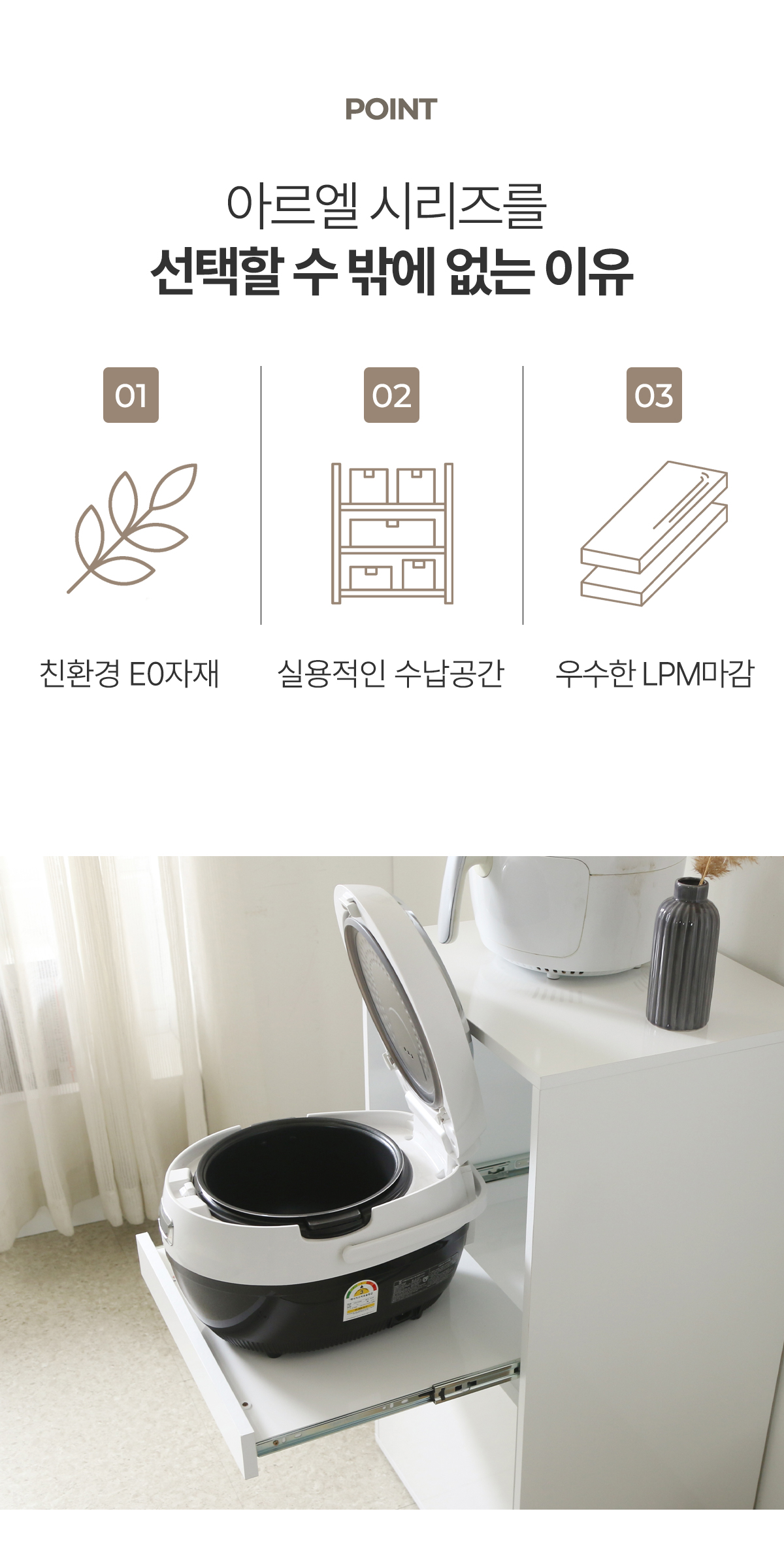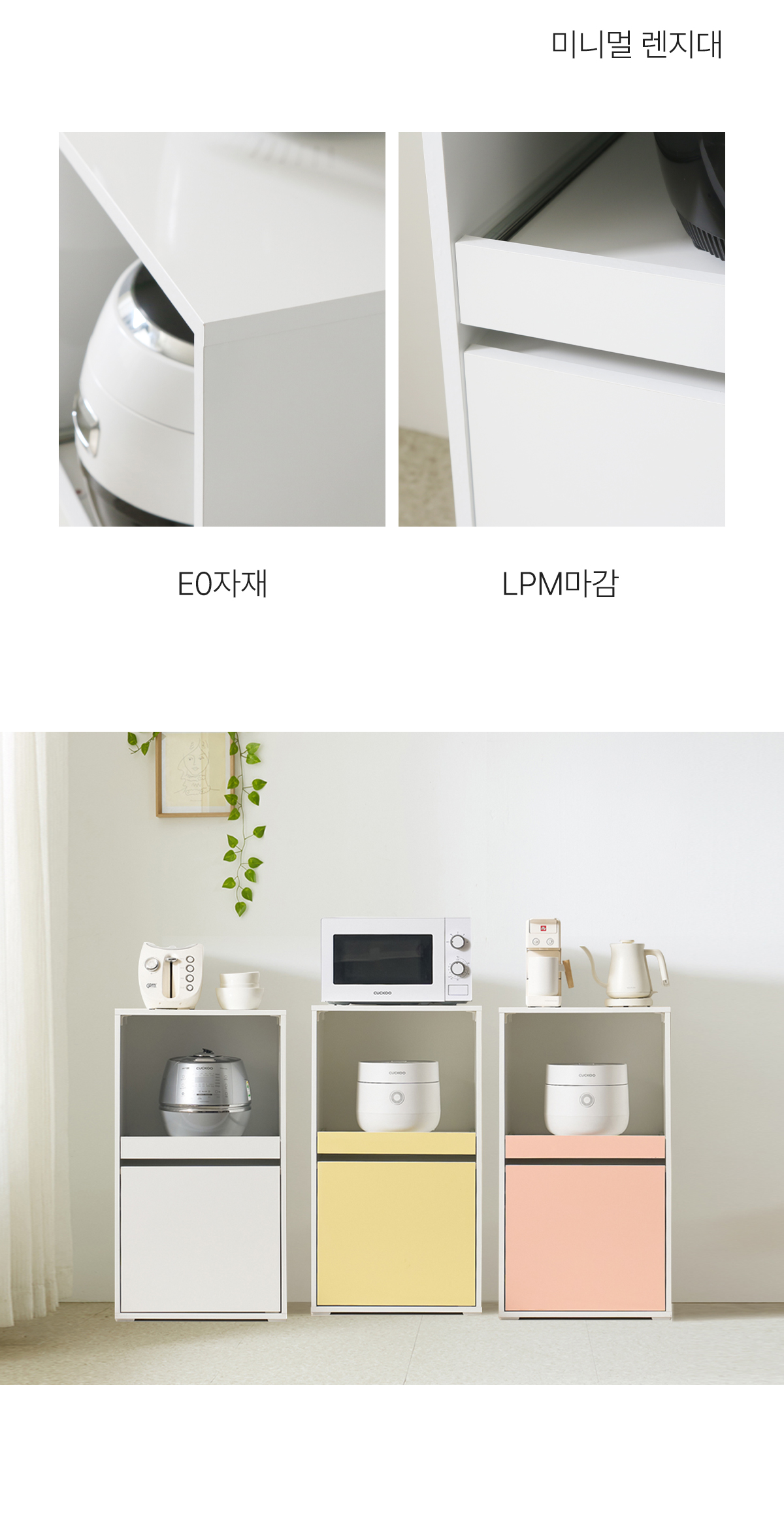 | 주요 소재 | E0 LPM, MDF, PB, 3단 볼레일, 댐퍼경첩 등 |