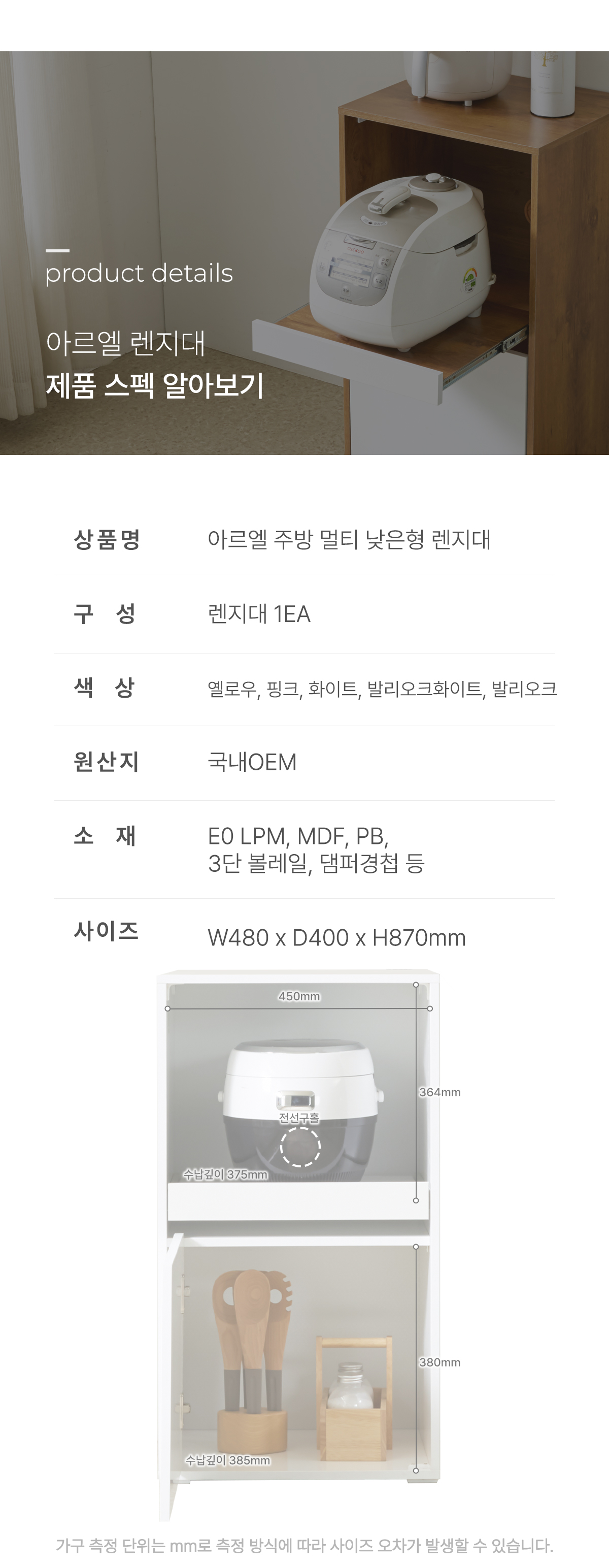 | 품명 | 아르엘 미니 주방 낮은 전자렌지 멀티 다용도 렌지대 500 (5color) |