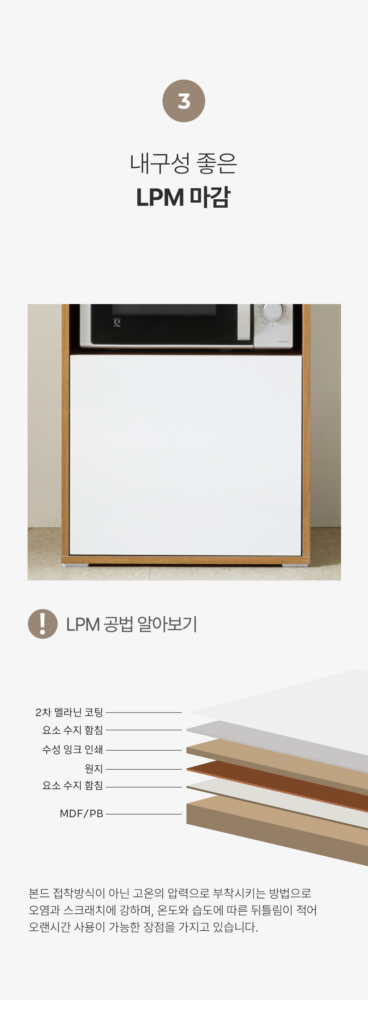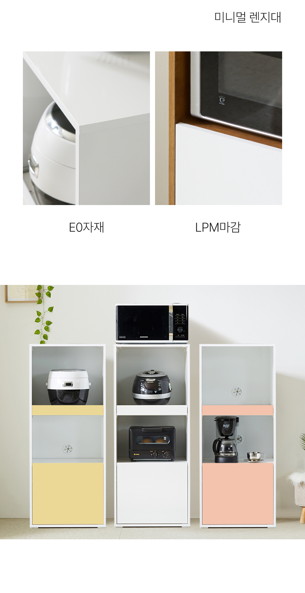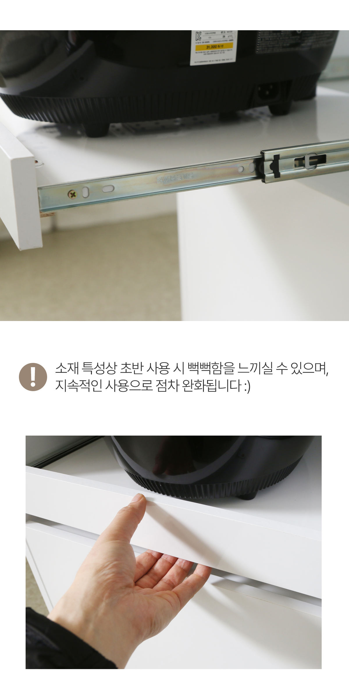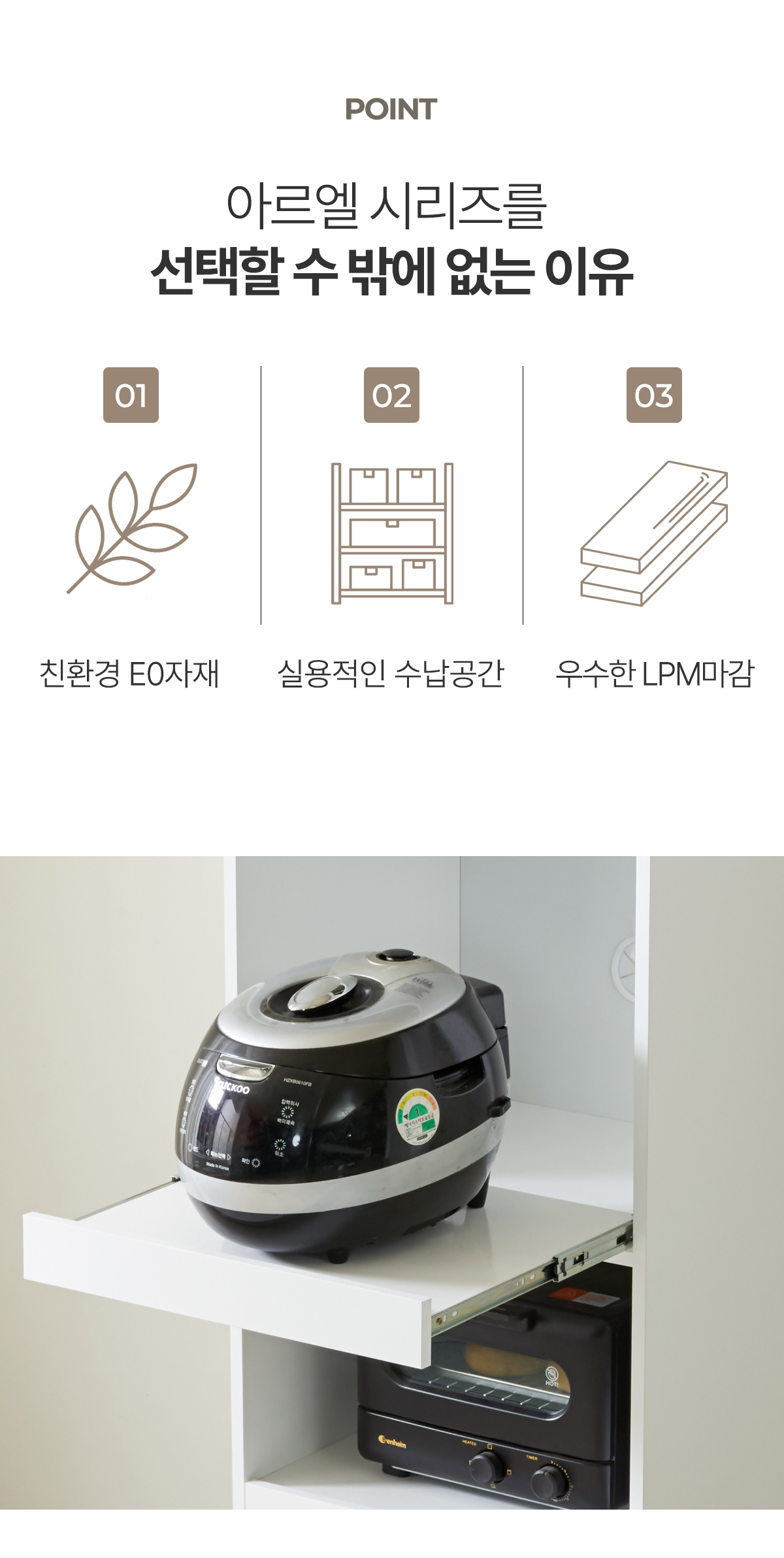 | 주요 소재 | E0 LPM, MDF, PB, 3단 볼레일, 댐퍼경첩 등 |