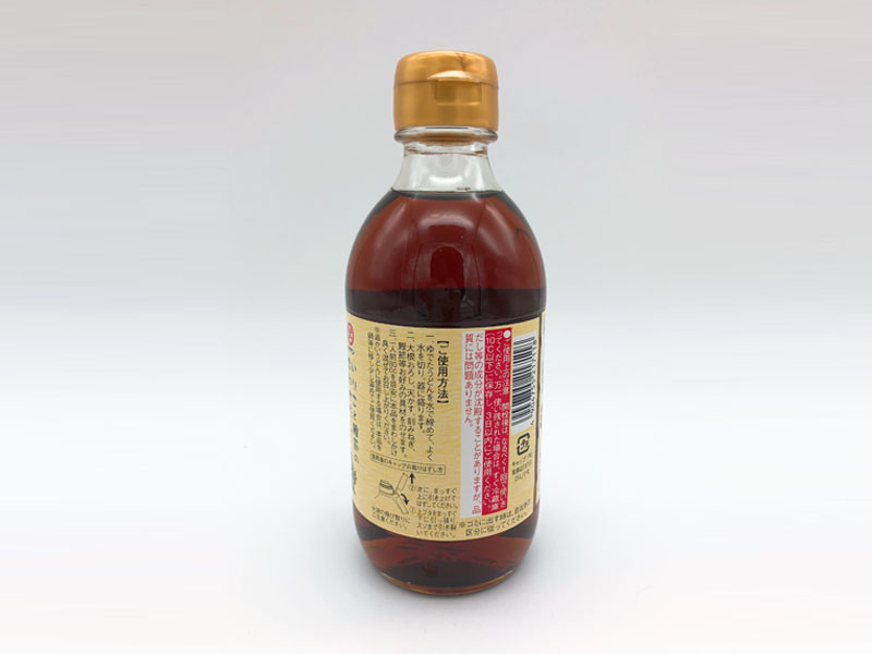 | 원재료명 | 소량 당함유 시럽(레어 슈가 스위트), 간장(본 양조), 소금, 가다랭이포 추출물, 설탕, 당류 발효 조미료, 멸치엑기스, 양조 식초, 얇게 깎은 가다랭이포, 멸치, 다시마추출물 가루, 조미료(아미노산 등),( 원자재 일부에 밀, 콩을 포함) |