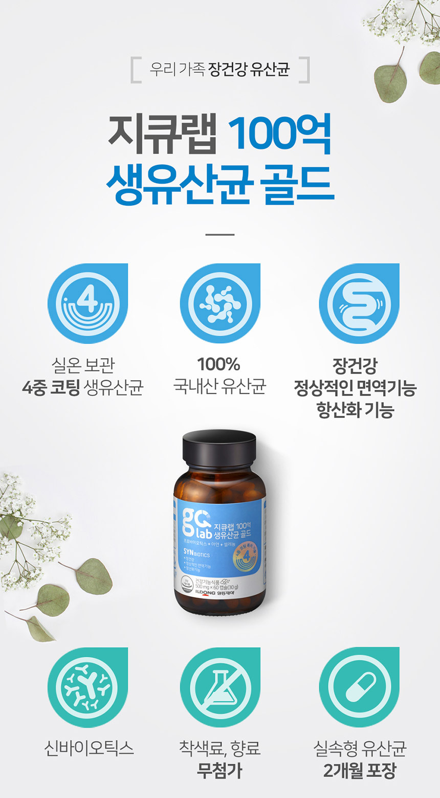 | 원료명 및 함량 | 락토바실루스 람노서스 IDCC 3201(난소화성말토덱스트린, 옥수수전분, 말토덱스트린,알파옥수수전분,프락토올리고당,제이인산칼륨,비타민C,분리대두단백,수화 히알루론산,구아검), 엔테로코커스페시움IDCC 2102(난소화성말토덱스트린,옥수수전분,말토덱스트린,트레할로스,분리대두단백,구아검,히알루론산),비피도박테리움 락티스 IDCC 4301, 비피도박테리움 롱검 IDCC 4101,건조효모(셀레늄함유/캐나다산),산화아연,락토바실루스 플란타럼 IDCC 3501, 말토덱스트린,유당혼합분말[유당(미국산),덱스트린],사과식이섬유(미국산),귀리식이섬유,일동 바실루스 코아글란스균,갈락토올리고당,프락토올리고당,스테아린산마그네슘,이산화규소,프로폴리스추출분말,베타글루칸분말,L-아르지닌,영지버섯자실체추출물 [우유,대두함유] 캡슐원료: 젤라틴,정제수,빙초산,자당지방산에스테르 [쇠고기, 돼지고기 함유] |