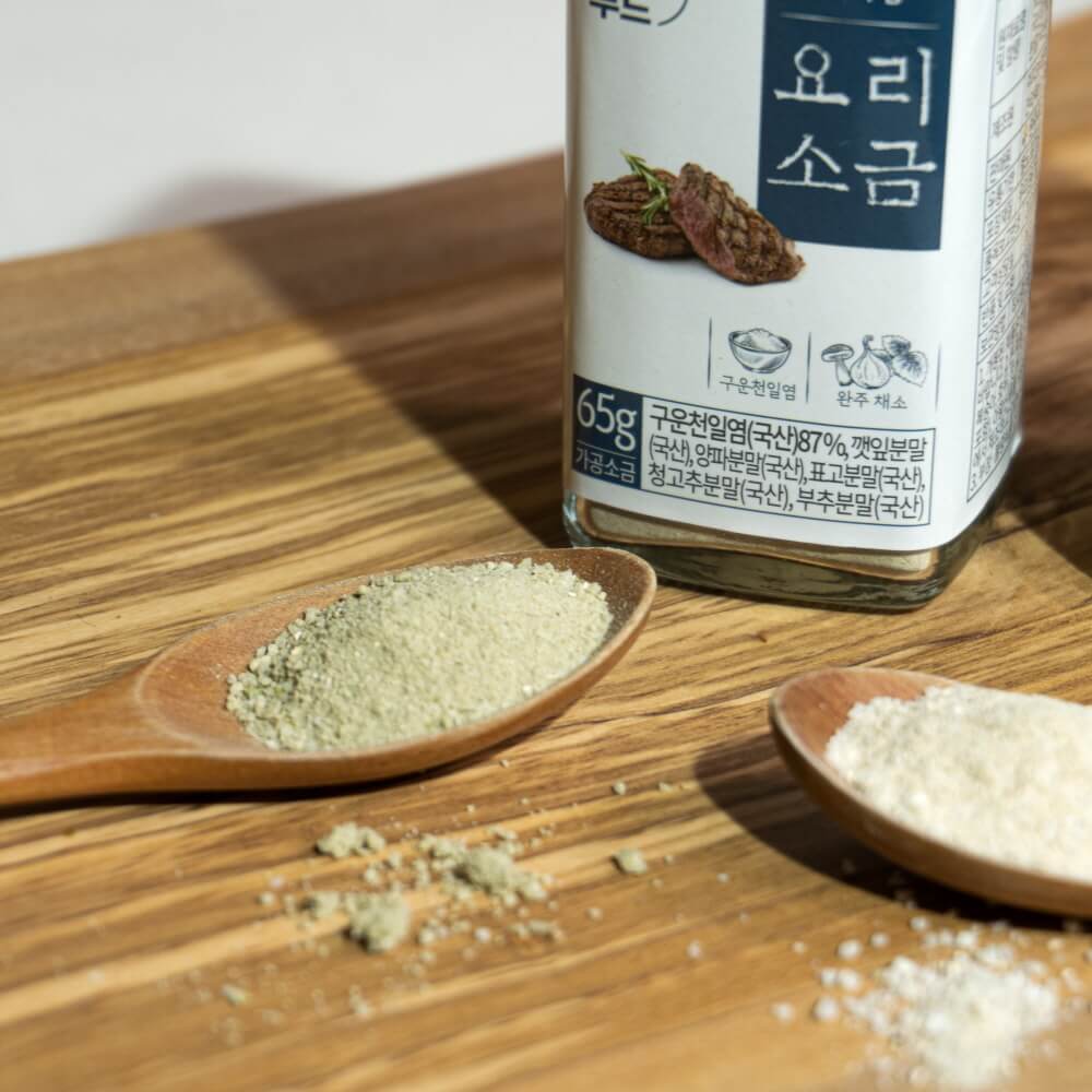 | 원재료명 | ▶ 구이용 : 구운천일염(국산)87%, 깻잎분말(국산) 4%, 양파분말(국산), 표고분말(국산) 7%, 청고추분말(국산), 부추분말(국산) ▶ 국, 찌개용 : 구운천일염(국산)85%, 표고분말(국산) 7%, 양파분말(국산), 수산물가공품[멸치(국산), 다시마(국산), 새우(국산), 표고(국산)] |