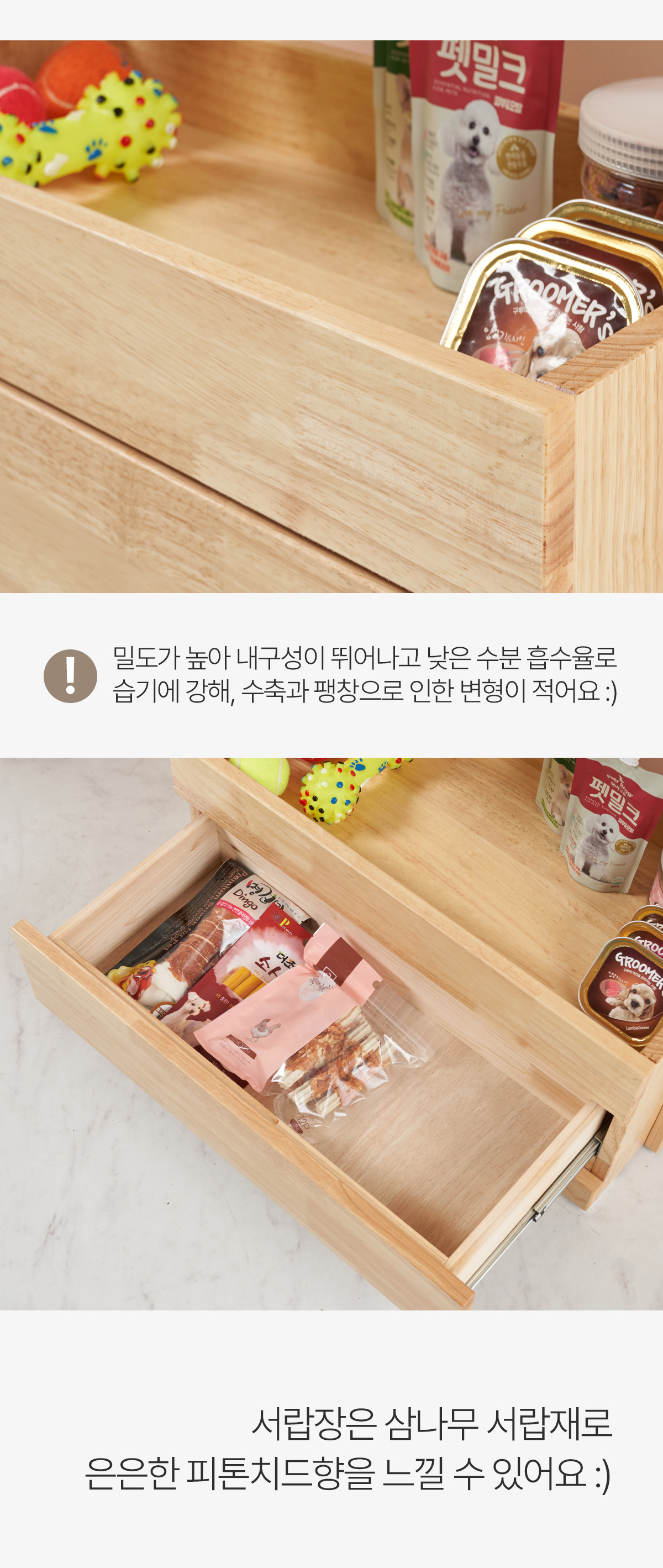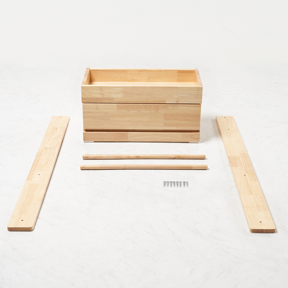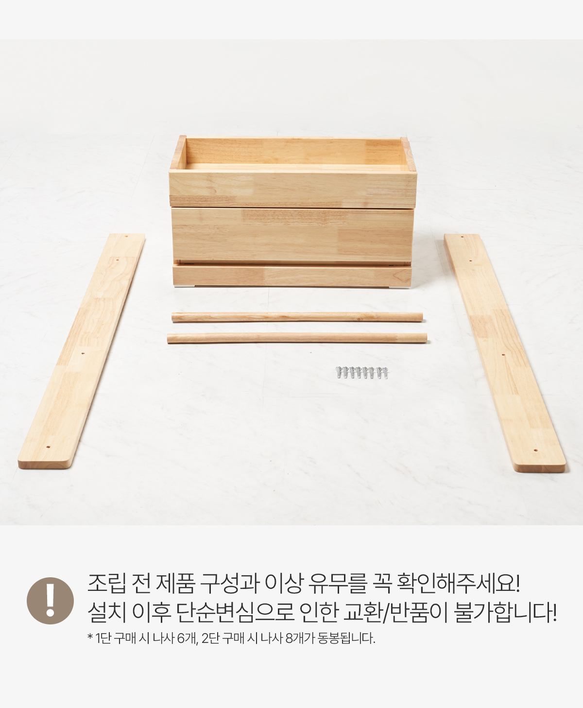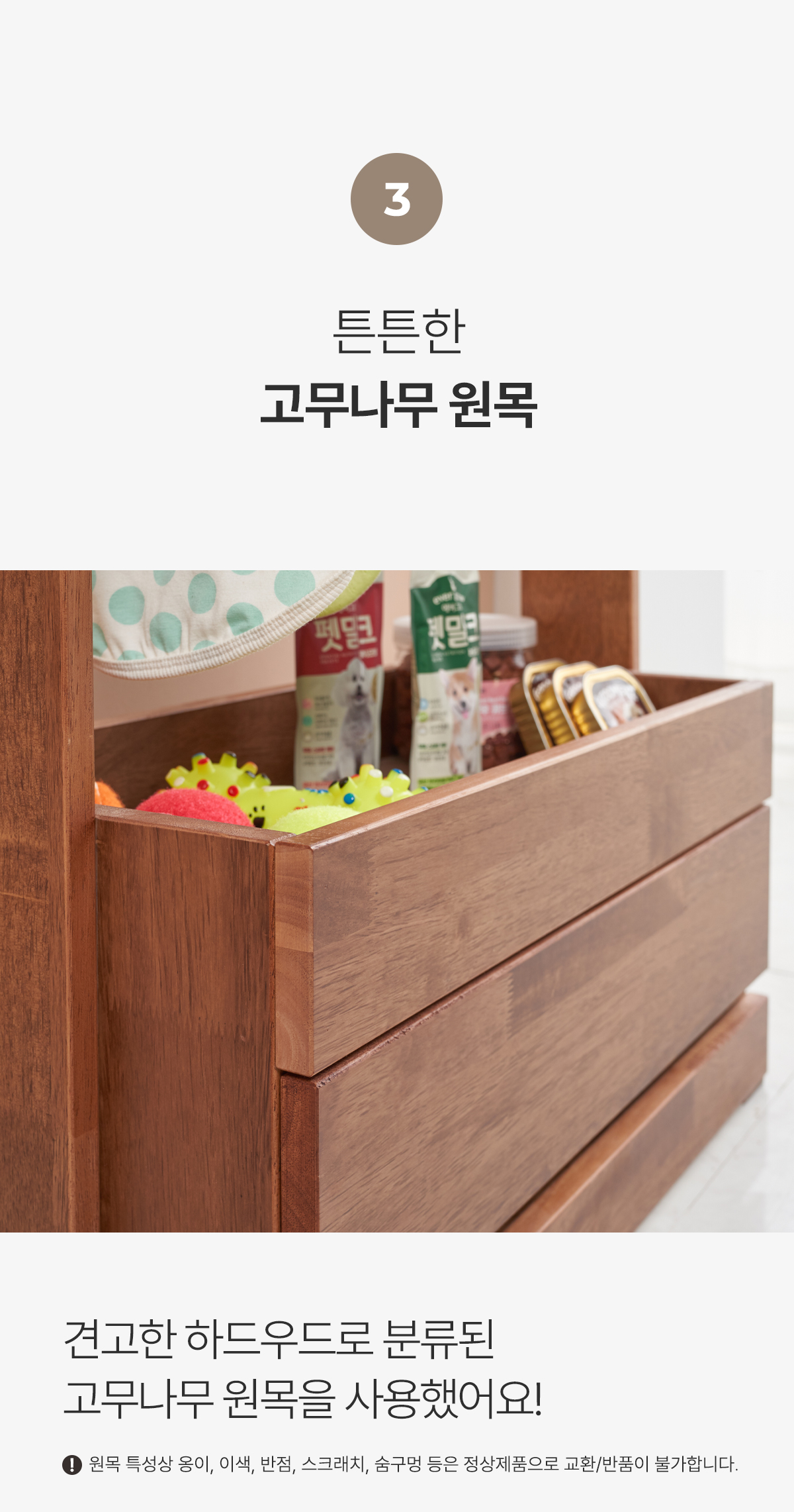 | 주요 소재 | 고무나무 원목, 고무나무 합판 4T(뒷판), 삼나무 원목(서랍), 3단 볼레일 등 |