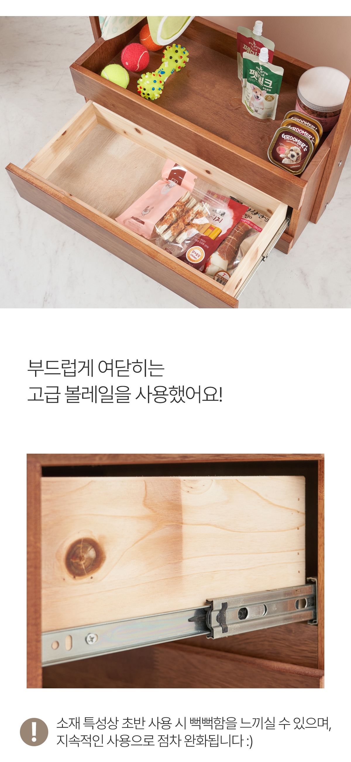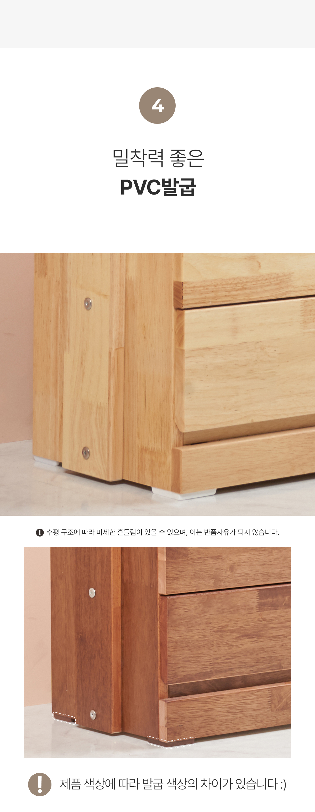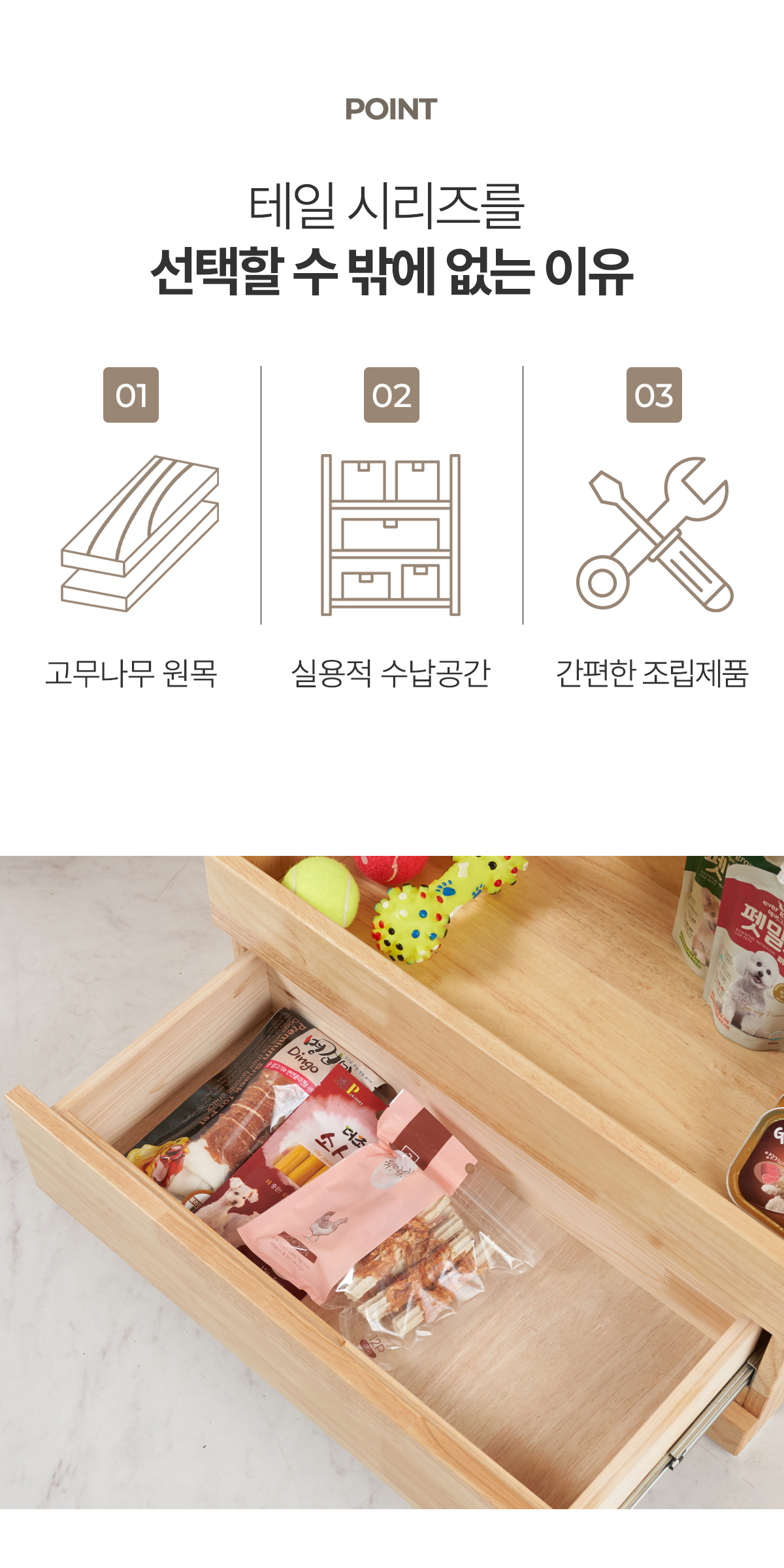 | 주요 소재 | 고무나무 원목, 고무나무 합판 4T(뒷판), 삼나무 원목(서랍), 3단 볼레일 등 |