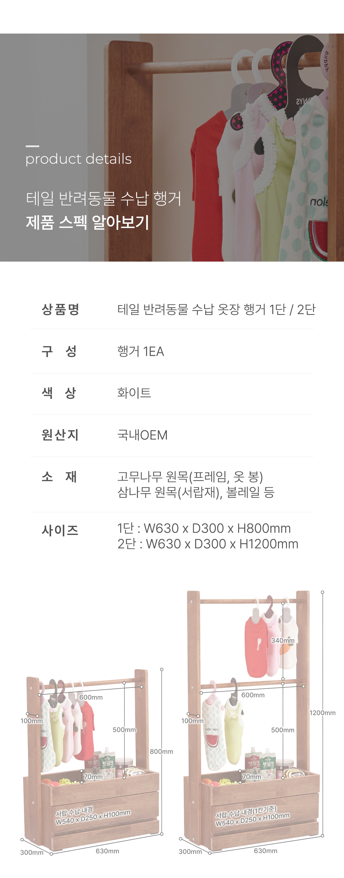 | 크기 | 1단 : W630 x D300 x H800mm / 2단 : W630 x D300 x H1200mm |